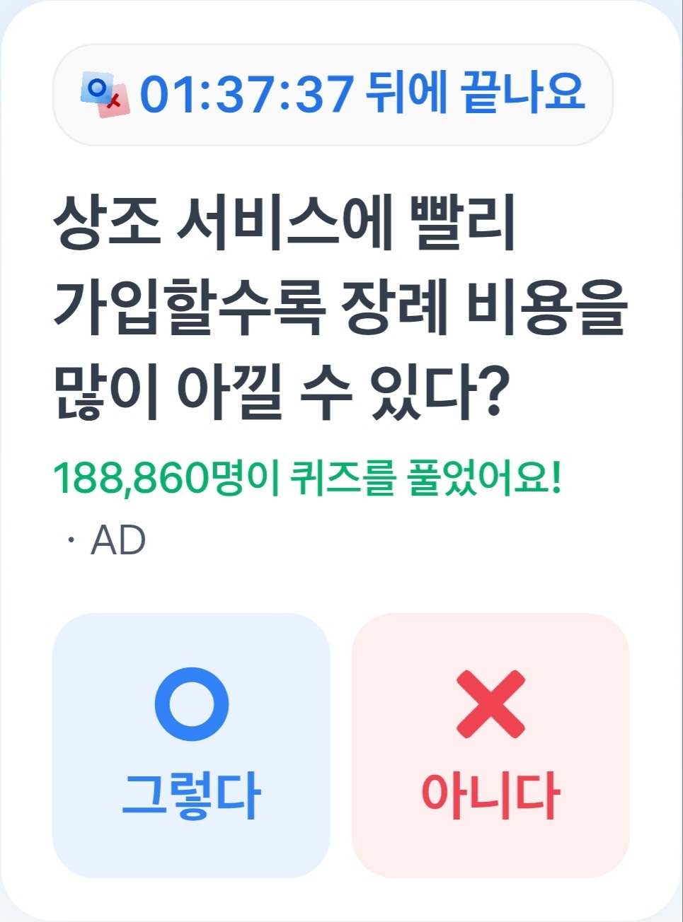 토스 11월 10일 퀴즈 정답 상조 서비스에 빨리 가입할수록 장례 비용을 많이 아낄 수 있다?