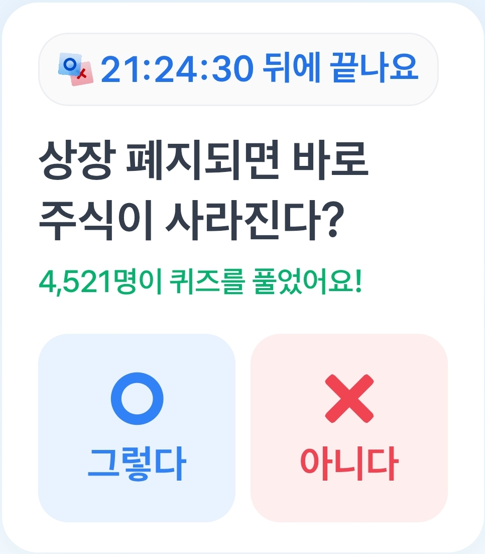 토스 11월 11일 퀴즈 정답 상장 폐지되면 바로 주식이 사라진다?