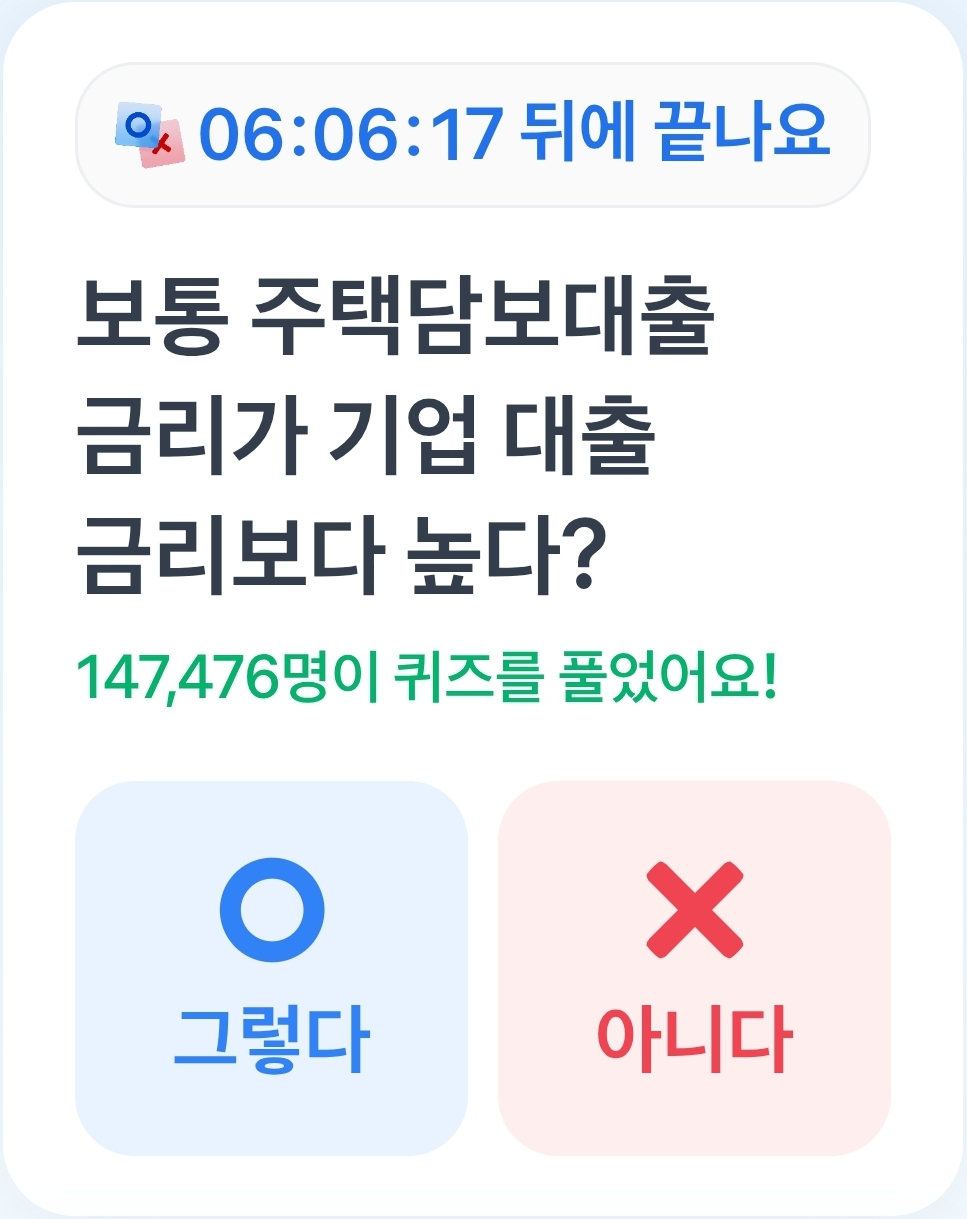 토스 11월 29일 퀴즈 정답 보통 주택담보대출 금리가 기업 대출 금리보다 높다?