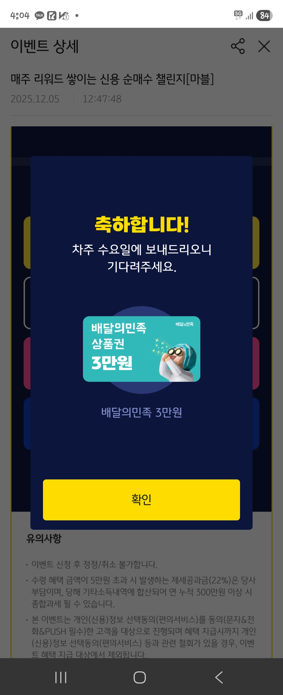 KB증권에서 신용 순매수 진행 시 랜덤으로 쿠폰을 지급하고 있습니다.