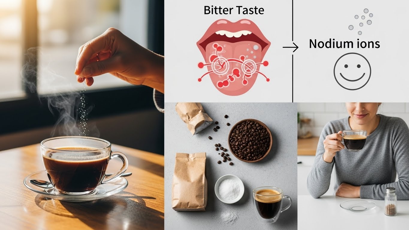 소금의 나트륨 이온은 혀가 쓴맛을 느끼는 감도를 떨어뜨려, 커피의 다른 긍정적인 맛(고소함, 산미)을 더 잘 느끼게 해줍니다.